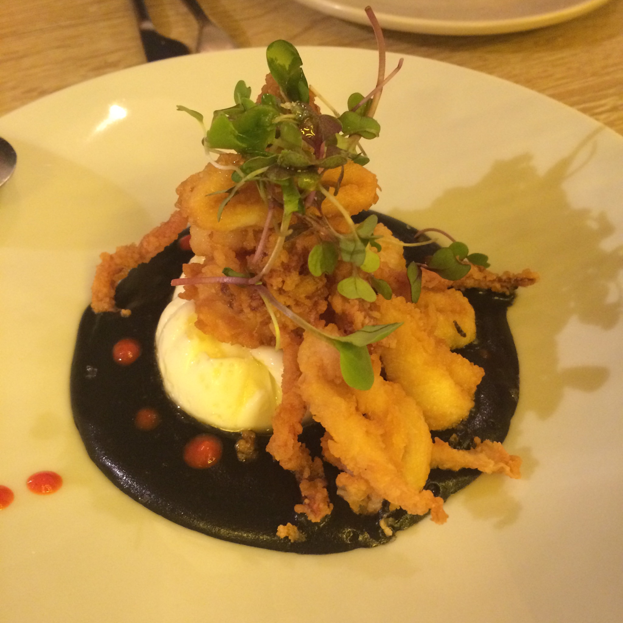 Cremoso de patata de tinta de calamar, huevo poché y patitas de chipirón