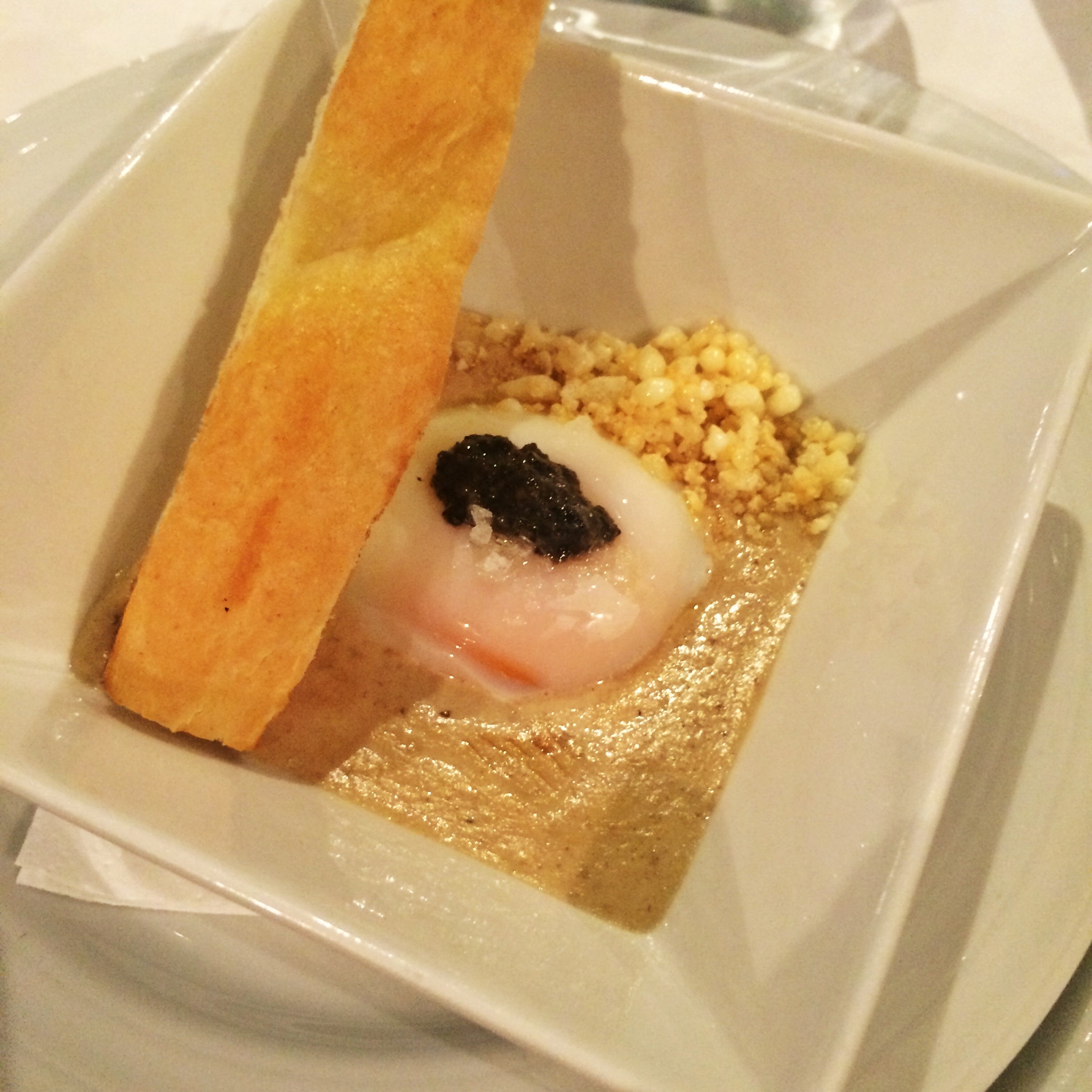 El segundo plato fue un huevo poché trufado sobre mousse de hongos, un homenaje a Abraham Garcia (Viridiana), donde encontramos productos de temporada muy bien elaborados. Un plato equilibrado, cuyo éxito se consigue gracias a la mezcla de ingredientes que componen el plato. Desde el huevo a la trufa negra, pasando por los hongos y consiguiendo el toque final con el crujiente arroz inflado ;).