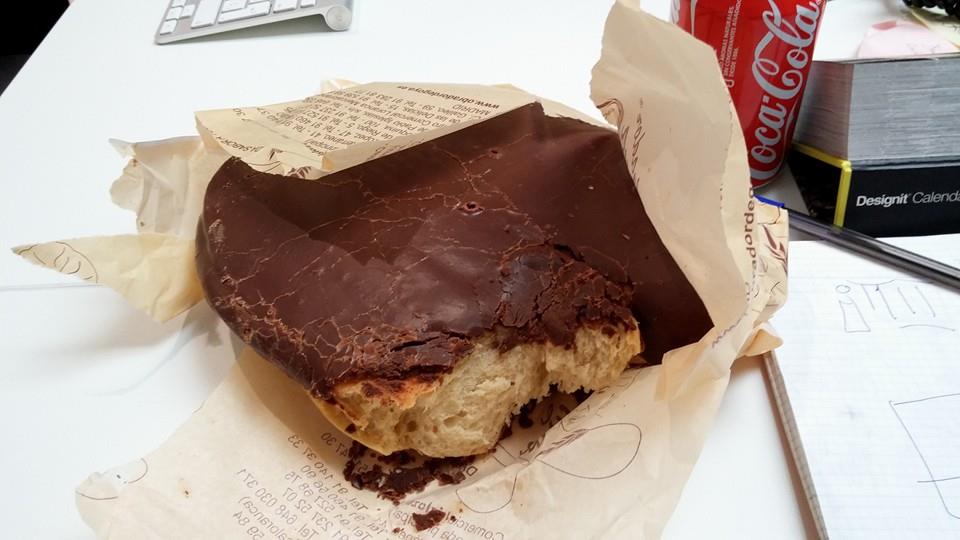 Gruesa,con hojaldre suave y esponjoso y una capa de chocolate generosa y muy dulce