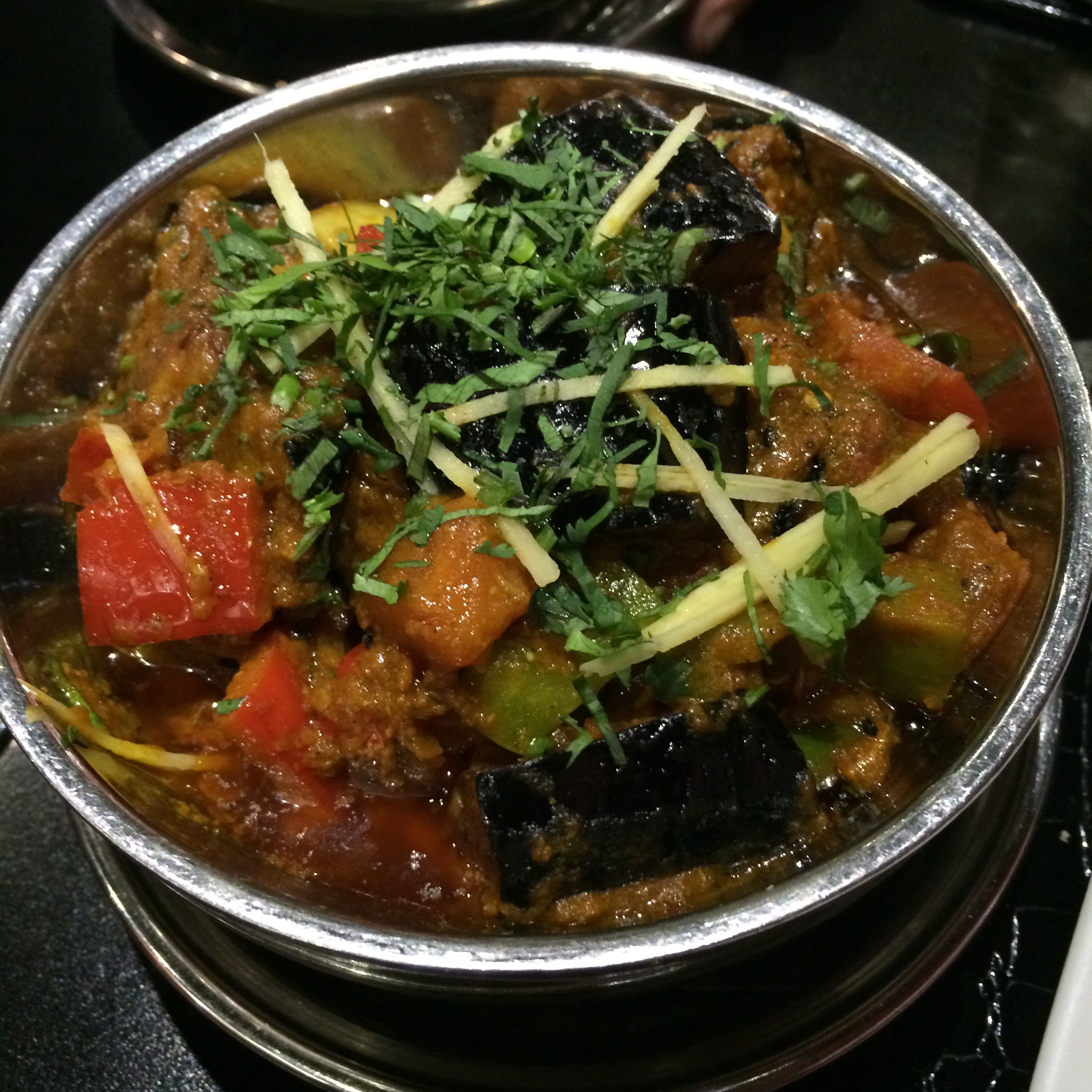 Y aunque nos recomendaron pedir un curry de cordero, al ser por la noche e ir con mi amiga Pau que no come mucha carne, preferimos pedir el de berenjenas con tomate, cebolla, pimientos, jengibre y cilantro (Massale wale baingan). Ideal para vegetarianos. Me gustó el toque crujiente que consiguen incorporando al guiso el jengibre y el cilantro.