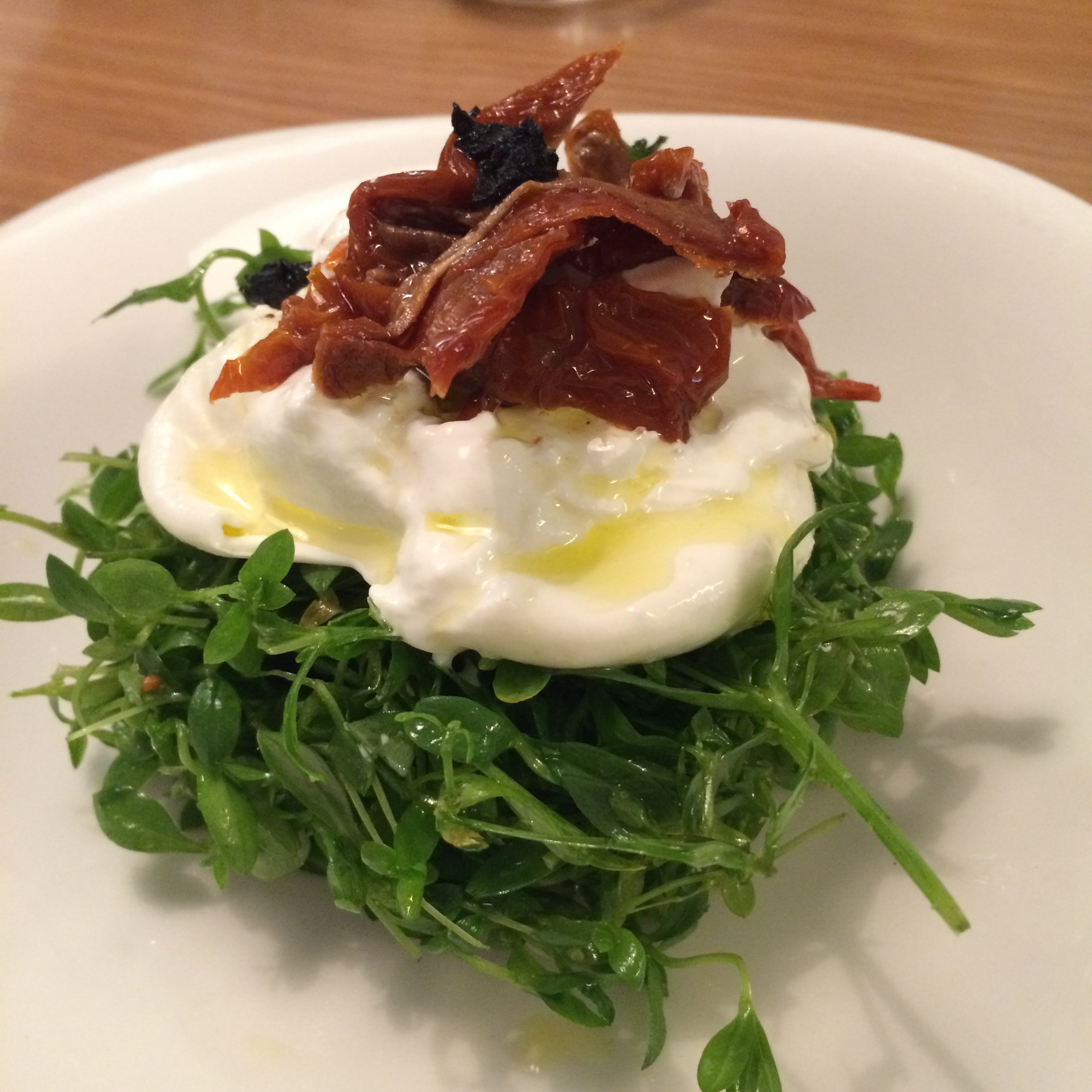 Como entrantes probamos la ensalada de burratina y pamplinas con tomate seco y aceite de trufa. Últimamente, los restaurantes se pasan un poco poniéndole trufa a todo lo que pillan…aunque admito que a mi flipa, así que una pizca no hace daño a nadie :).