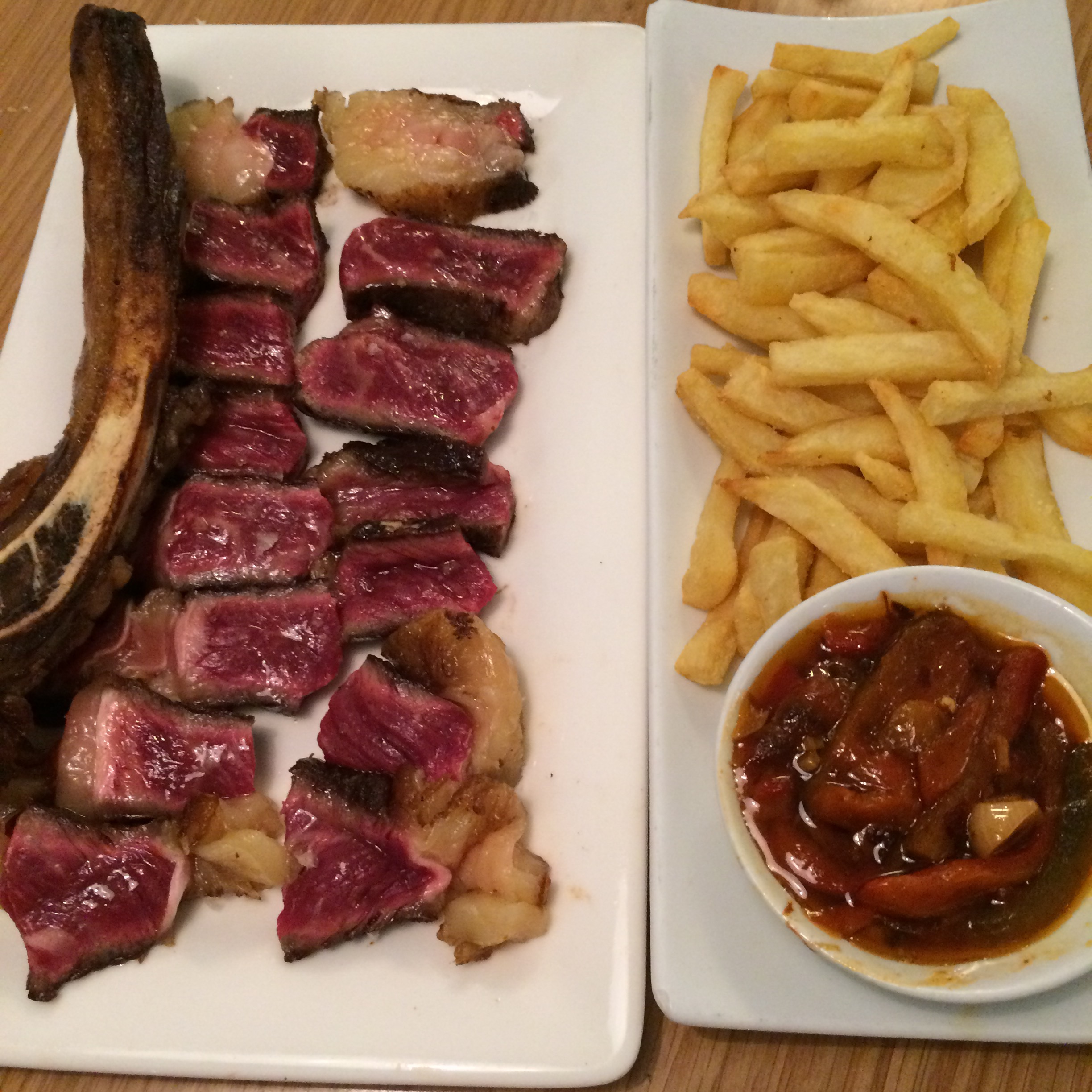 El plato estrella lo reservaron para el final: un kilo de carne de vaca rubia gallega con maduración de 45 y 60 días. Troceada, con su hueso para que los carnívoros rebañen si se quedan con hambre y con patatas fritos y pimientos confitados como guarnición. Sólo diré que a los 3 comensales que estábamos sentados en aquella mesa de La Vaca y la Huerta se nos hacía la boca agua al ver el platazo que teníamos delante. Daba pena empezarlo…pero una vez nos pusimos con ello, no queríamos que se acabase. Como mantequilla en boca. Nos dimos un homenaje de carnaza y me lo volvería a dar ahora mismo. Se ha convertido en un sitio de referencia para ir a tomar buena carne.